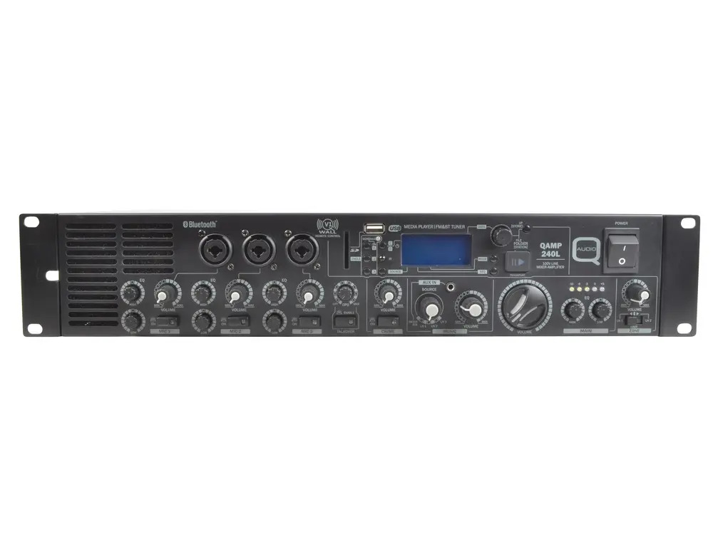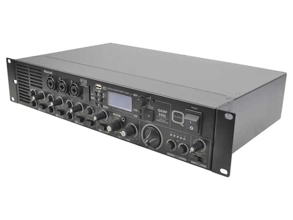 This high impedance installation amplifier offers a powerful 240 watt 100v line output. The QAMP240L is ideal for various audio applications including bar, restaurant, gymnasium, and school installations. It includes a versatile mixer section accommodating 1 music and 3 microphone inputs. The music source is switchable between a media player and 3 external line inputs with gain control, and a front side 3.5mm jack line input.