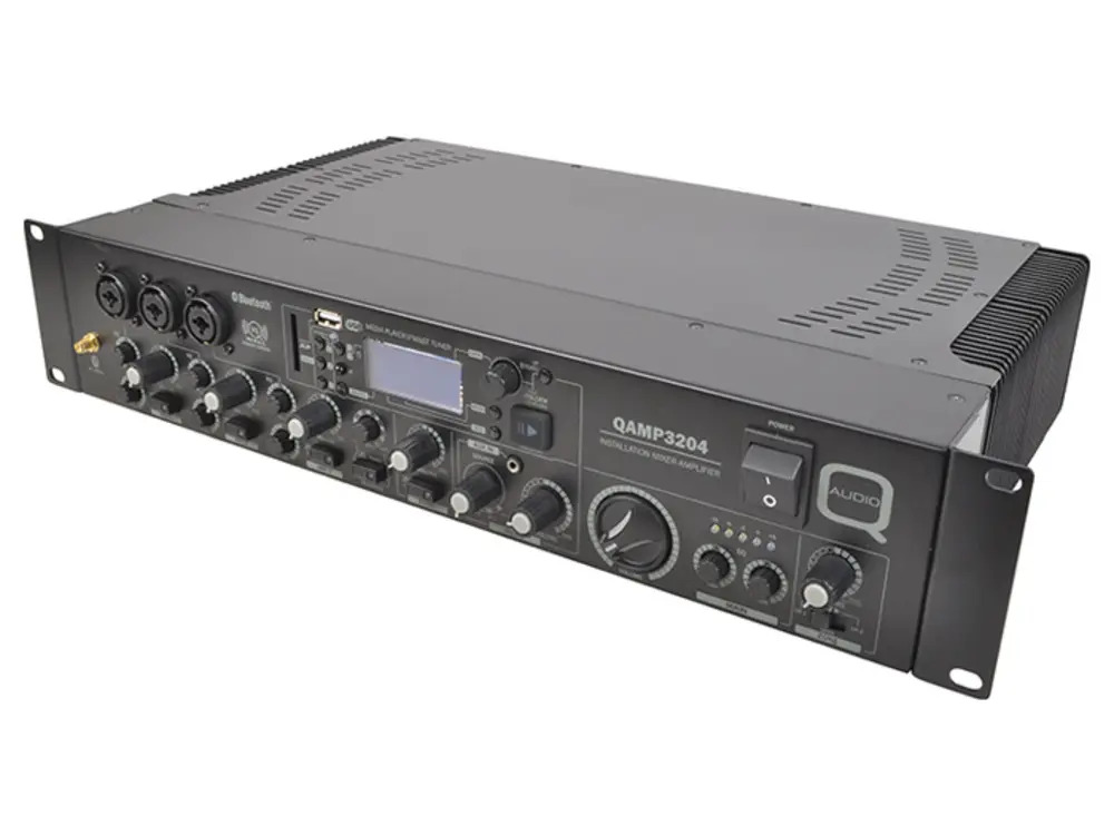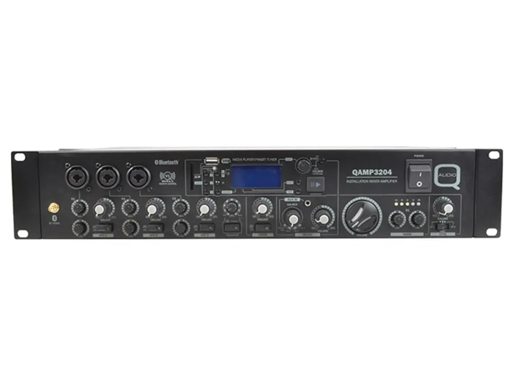 This low impedance installation amplifier offers powerful stereo output with 2 x100W at 8 Ohms, 2x 160W at 4 Ohms RMS. The QAMP3204 is ideal for various audio applications including bar, restaurant, gymnasium, and school installations. It includes a versatile mixer section accommodating 1 music and 3 microphone inputs. The music source is switchable between a media player and 3 external line inputs with gain control, and a front side 3.5mm jack line input.