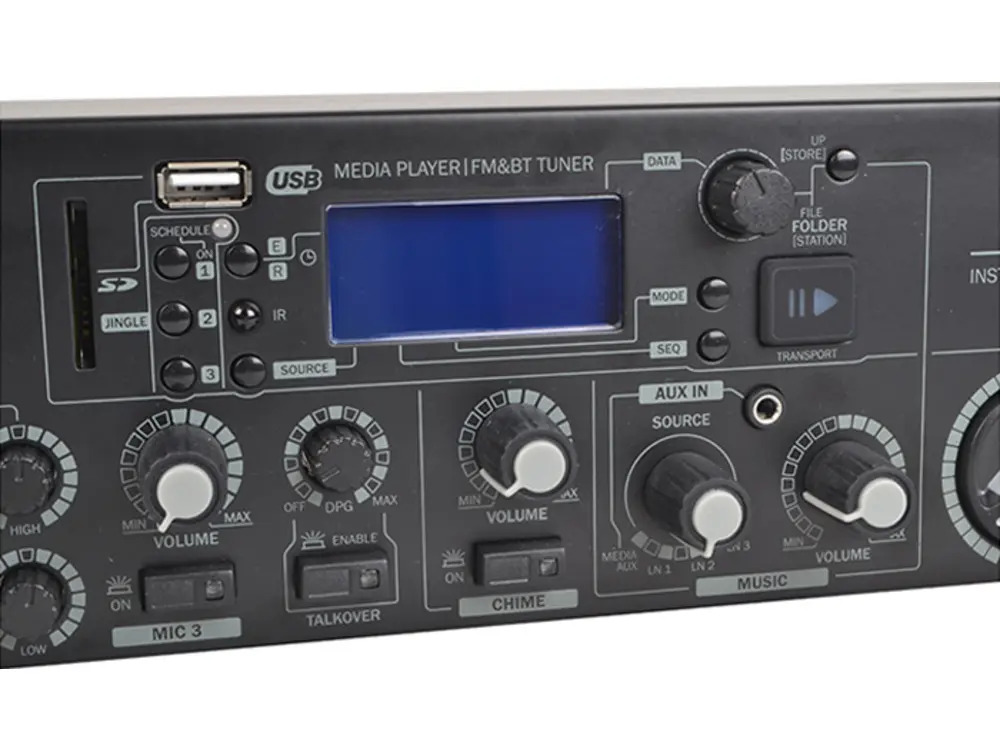The internal media player supports a FM tuner, Bluetooth receiver, USB thumb drives and SD cards up to 16GB/2000 songs, with MP3 file name display on a large LCD screen. It offers regular and random play modes, elapsed/remaining time display, and an FM tuner with RDS station information. The jingle player is an additional bonus feature for playing announcements and advertising, up to 3 jingles can be played. The jingles can be scheduled or played back via the pressing 1 of 3 switches on the front panel.
