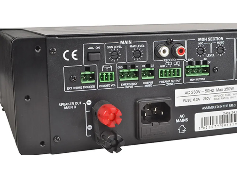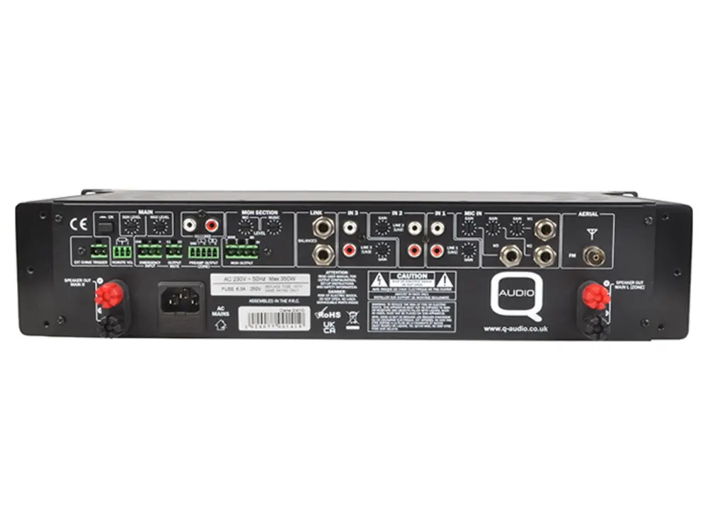 Microphone inputs are equipped with phantom power, isolation transformer (Mic 1 only), LPF & Gain controls at the rear, and volume and EQ controls at the front, along with an on/off switch. An adjustable auto talk-over function ensures automatic reduction of music levels during announcements.
