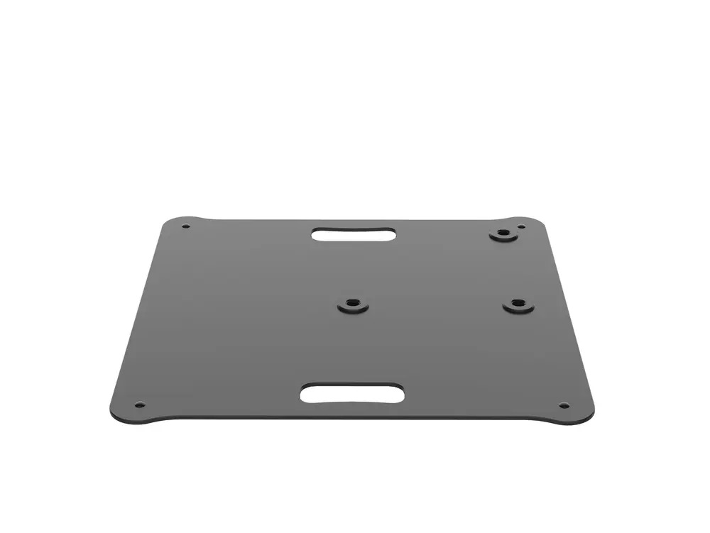 A black flat square baseplate for 35mm poles, designed to provide a heavy-duty and professional support solution for lighting, speakers and accessories in a wide range of event and installation applications.