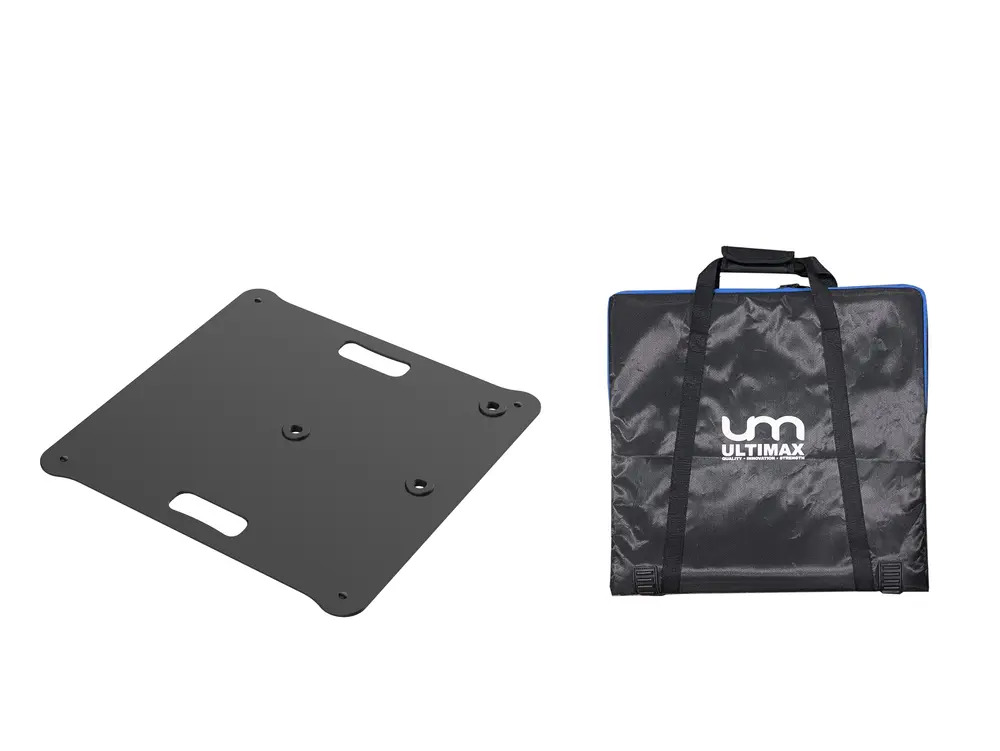 The Ultimax UTX BASE 6 BK is a flat square baseplate designed for use with 35mm poles, offering a strong and dependable support solution for lighting, speakers and accessories. With a 60 x 60cm footprint, 17kg weighted design and 60kg load capacity, it is ideal for applications where increased stability and higher loading capacity are required. Featuring 3x M20 screw mounting positions for 35mm poles, raised rubber feet, 2x grab handles and a durable black powder coated finish, the UTX BASE 6 BK is built for demanding day to day use. A padded carry bag is also included for easier transport and storage. The live product page confirms the model name UTX BASE 6 BK, but the fuller spec points used here come from the details you supplied.